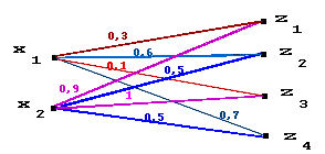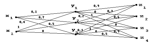Ниже приведены графы, соответствующие R1 и R2, "склеенные" по Y. В полученном графе рассматриваем пути от xi к zj и каждому ставим в соответствие минимальный из "весов" его составляющих. Затем определяем максимум по всем путям из xi в zj, который и дает искомое m(xi,zj).