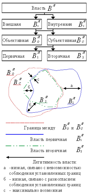 От субъективной и объективной властей, зависит такое понятие как легитимность власти, которая выражается в расхождении в определении границ между первичной и вторичной властью. На это расхождение влияют два фактора – невозможность соблюдения границ (проявление объективной власти), и различная несогласованность в процессе их соблюдения (проявление субъективной власти).