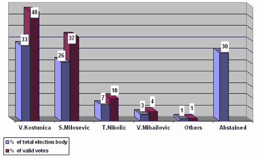 "Из всего зарегистрированных 7.848.818 избирателей, проголосовало 5.036.478 или 64.16 процента. Из этого числа президентские кандидаты получили следующее количество голосов: 1. Воислав Коштуница – 2.428.714 или 48.22 процентов 2. Слободан Милошевич – 2.026.478 или 40.23 процентов 3. Томислав Николич – 256.876 или 5.10 процентов 4. Воислав Михайлович – 130.598 или 2.59 процента 5. Миролюб Видойкович – 40.765 или 0.80 процентаНедействительных бюллетеней оказалось 3.03 процента."