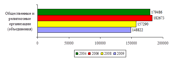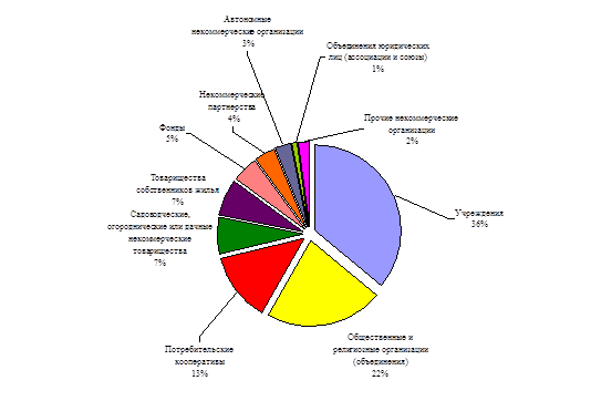 Согласно «Докладу о состоянии гражданского общества в Российской Федерации», подготовленному общественной палатой в 2009 г. общая численность некоммерческих организаций (кроме бюджетных НКО, учрежденных органами государственной и муниципальной власти) в Российской Федерации на 1 января 2009 г. составляла 669,9 тыс. Примерно половина от общего числа зарегистрированных организаций третьего сектора приходится на учреждения, общественные и религиозные организации (объединения) – 36% и 22% соответственно от общей численности НКО.