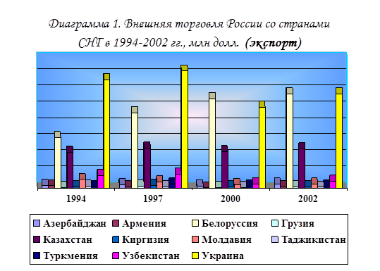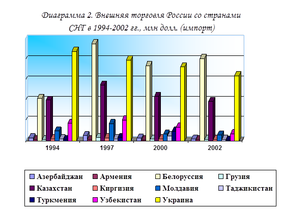 Если анализировать экономические стратегии взаимодействия России со странами СНГ, то они развивались крайне неравномерно. Наибольшим динамизмом отличались внешнеторговые связи с Украиной и Белоруссией, тогда как наименьшие показатели во внешней торговле наблюдались с Арменией и Грузией (см. диаграммы 1 и 2[11]).