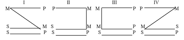 Разумеется, силлогизм может составляться также и из суждений с иными качественно-количественными характеристиками, чем в приведенном примере. Чисто математически всего возможно 256 комбинаций разных категорических суждений, объединенных по три. Однако далеко не все из них образуют силлогизмы. Тех сочетаний, которые приводят к правильным выводам, всего 19. Все правильные силлогизмы принято разбивать на четыре разновидности, называемые фигурами. Они различаются местом среднего термина.