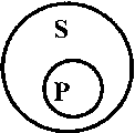 Общеутвердительное суждение - общее по объему и утвердительное по качеству связки. Его структура: "Все S есть Р", а символом служит латинская буква "А". Примером может служить следующее суждение: "Всякое изучение иностранных язы ков развивает ум, сообщая ему гибкость и способность проникать в чужое миросозерцание" (Д.И. Писарев). Второй пример: "Все окуни - рыбы". В этих суждениях объем предиката шире объема субъекта и является его подчиняющим понятием. Объемные отношения субъекта и предиката в таких суждениях можно изобразить в виде указанной круговой схемы. Из нее видно, что объем S составляет только часть объема Р, так