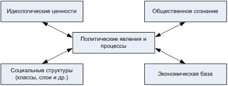 Поле политики можно представить в виде аналитической модели (см. рис. 1). В центре поля находятся политические явления и процессы. Их развитие в политически организованном обществе во многом зависит от позиции государственных и иных политических организаций и структур.