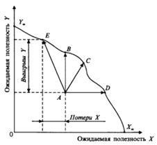 Рассмотрим это на конкретном примере (см. рис. 4). Отложим ожидаемую полезность от принятия политического решения для индивида Х на оси абсцисс, а ожидаемую полезность индивида Y - на оси ординат. Кривая потребительских возможностей будет выглядеть как YmEBCDXm. Если первоначальное положение индивидов характеризуется точкой А, то сектор ABCD является областью Парето-оптимальных решений. Это означает, что перемещаясь из точки А, например, в В мы улучшаем положение индивида Y, не ухудшая полезности индивида X. Переходя из точки А в D, мы улучшаем ожидаемую полезность X, не уменьшая полезности Y. Наконец, при движении в точку С выигрывают оба. Однако если возможны компенсационные платежи, то область возможных политических решений заметно увеличивается. Например, при движении из А в E выигрыш индивида Y настолько велик, что он может часть своего выигрыша уступить пострадавшему X, купив тем самым его согласие на такое перераспределение. Таким образом, с помощью логроллинга (используя компенсационные платежи) можно улучшить благосостояние общества в целом, даже если кто-то несет при этом прямые убытки.