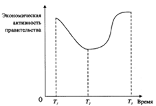 Деятельность правительства между выборами подчинена определенным закономерностям. С известной долей условности она может быть описана как политико-экономический (политический деловой) цикл. После выборов осуществляется ряд мер, направленных на изменение целей или масштабов деятельности предшествующего правительства. Эти меры носят особенно радикальный характер, если к власти приходит партия, до этого находившаяся в оппозиции. Предпринимаются попытки по сокращению дефицита государственного бюджета, сворачиванию непопулярных программ, перестройке работы государственного аппарата. Вновь пришедшие к власти люди стараются выполнить хотя бы часть предвыборных обещаний. Однако затем активность снижается до тех пор, пока падение популярности нового правительства не достигает критического уровня. С приближением следующих выборов активность правительства возрастает. Если отложить на оси абсцисс время, а на оси ординат - активность правительства, то описанный цикл в общем виде будет выглядеть примерно так как на рисунке 6.