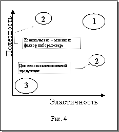 Более наглядно факторы эффективности использования того или иного подхода к организации маркетинга представлены на рис. 4. На схеме изображена область применения каждого из первых трех подходов в разрезе таких рыночных показателей, как ценность или полезность продукта (и с точки зрения потребительских качеств товара, и с точки зрения массовости его использования); эластичность спроса по цене (для первой и третьей концепции) и по качеству (для второй).