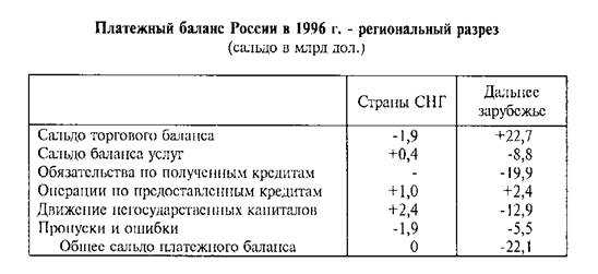 Никаких кредитов от стран СНГ Россия, естественно, не привлекает, но зато постепенно растет сумма средств, поступающих в погашение ранее предоставленных российских кредитов (в 1996 г. эти поступления приблизились к 1 млрд дол.). Тем не менее во взаимоотношениях с некоторыми странами СНГ проблема своевременного взыскания внешних долгов становится все более серьезной из-за сложностей в изыскании средств для оплаты российских энергоносителей. В противовес утечке капиталов на Запад наблюдается постепенно растущий приток в Россию частных капиталов из стран СНГ, прежде всего в оплату за наличную иностранную валюту, поступающую туда через российские каналы в порядке реэкспорта. В конечном итого сравнительно небольшой пассив по текущим операциям компенсируется положительным результатом движения капиталов и, таким образом, платежный баланс в целом пребывает в относительно уравновешенном состоянии. В свою очередь, равновесие платежей и расчетов способствует стабилизации курса рубля по отношению к национальным валютам стран СНГ.