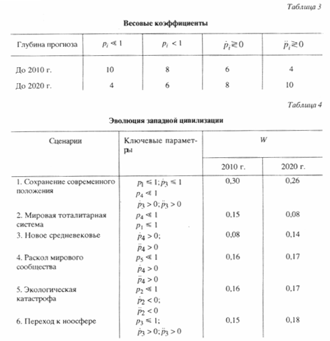 этих параметров соответствует анализу путей эволюции, обобщенных в табл. 2. В следующих столбцах табл. 4 приведены результаты расчета вероятностей эволюции по каждому из сценариев для двух различных глубин прогноза - до 2010-го и 2020 года (во втором случае предполагалось, что в предшествующий период времени радикальных изменений не произойдет)