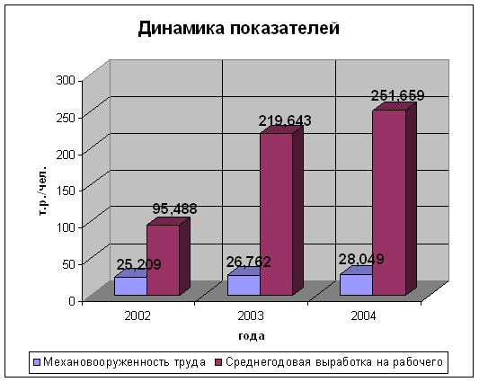 Вывод: За анализируемый период с 2002года по 2004 получены следующие результаты: наблюдается рост объема работ в течении 3 последних лет, однако темп роста снизился на 117,82% (111,85%-224,67%); среднегодовая стоимость основных фондов выросла за 2003 год по сравнению с 2002 годом на 15 тыс. руб.(4165-4150), за 2004 год изменений не произошло. Аналогичное положение наблюдается с изменениями среднегодовой стоимости активной части ОПФ. Фондоотдача за последние три года растет, но заметно снижение темпа роста на 112,13% (111,83-223,96).То же самое наблюдается и с фондоотдачей активной части ОПФ, темп роста за период с2003 года по 2004 год также снижается. Произошло снижение фондоемкости, что оценивается положительно, притом растет темп снижения. Наблюдается увеличение механовооуженности, что оценивается положительно. Она показывает, какая стоимость активной части приходится на одного работника. Также за период с 2002-2004 год происходит увеличение выработки на одного рабочего: за 2003 год по сравнению с 2002 годом выработка увеличилась на 124,155 тыс. руб. (219,643-95,488), а за 2003 год по сравнению с 2003 – на 32,016 тыс. руб. (251,659-219,643).Темп роста выработки за последний год снизился, что нельзя оценить положительно.