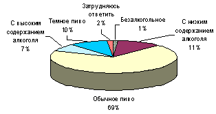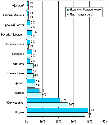 Наиболее популярным типом пива среди россиян является обычное светлое пиво (диагр. 1). Его пьют чаще всего 70% потребителей. На долю темного пива приходится около 10% предпочтений, с пониженным содержанием алкоголя — 11%, с высоким содержанием алкоголя — 7%. При этом обычное светлое пиво одинаково активно употребляют и мужчины, и женщины. Вопреки распространенному мнению о том, что темное пиво больше любят женщины, результаты исследования показывают, что такое пиво одинаково популярно среди представителей обоих полов. Пиво с пониженным содержанием алкоголя следует считать преимущественно женским продуктом, в то время как пиво с высоким содержанием алкоголя — мужским продуктом. Среди потребителей некрепкого пива доля женщин в 2,5 раза больше, чем мужчин, а среди потребителей пива с высоким содержанием алкоголя мужчин в 3 раза больше, чем женщин.