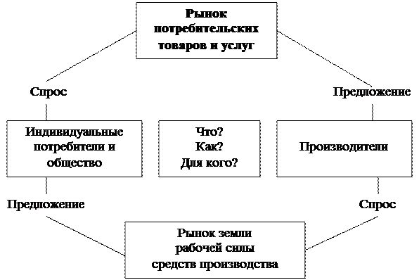 Рынок - это специфический способ организации экономической деятельности, где хозяйственные отношения между людьми выступают как отношения между товарами, причем между производителем и потребителем нет; никаких промежуточных планирующих, управляющих и других административных учреждений, а всеобщим эквивалентом является товар особого рода - деньги.