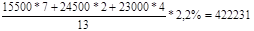 1). База для начисления – оплата по договорам гражданско-правового характера Сумма взноса: 110000*23,1%= 25410 руб. 2). Сумма взноса от оплаты труда работников (6 человек), чей доход превысил 415000 руб.: 415000*6*26%=647 400 руб. |