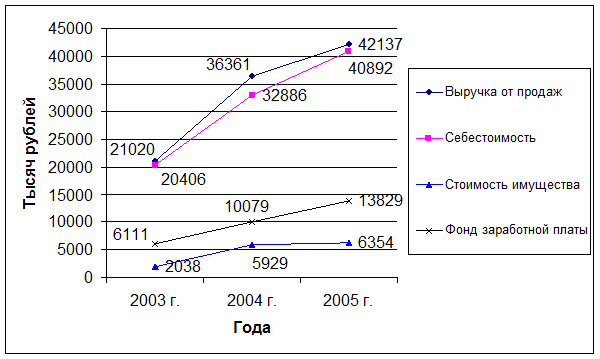 Исходя из данных таблицы 1, можно сделать вывод, что в 2005 г. предприятие ЗАО «АРНО», получило более чем, в 2,0 раз больше выручки от продаж или на 21117 тыс. руб., по сравнению с 2003 г.