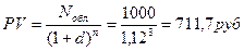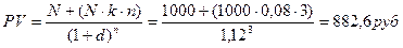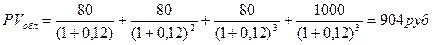 Требуется определить текущую стоимость трехлетней облигации, номинал которой 1000 руб. и с купонной ставкой 8% годовых, выплачиваемых раз в год, если норма дисконта (рыночная ставка) равна 12% годовых.