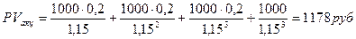 Номинальная стоимость акции- 1000руб., уровень дивидендов - 20%, ожидаемая курсовая стоимость акции в конце периода ее реализации - 1100 руб., рыночная норма доходности - 15%, период использования акции — 3 года, периодичность выплаты дивидендов один раз в году.