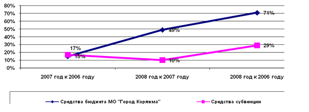 За исследуемый период значительно увеличился объем ассигнований, выделяемый из бюджета МО «Город Коряжма» и областного бюджета на функционирование учреждения. На рис.1 показано изменение темпа прироста финансирования МОУ «СОШ №6» из бюджетов разных уровней за период 2006-2008гг.