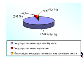 Согласно отчету о состоянии государственного внутреннего и внешнего долга Российской Федерации государственный внутренний долг на 1 января 2008 года составил 1 301 151,9 млн. рублей (3,9 % ВВП за 2007 год); на 1 января 2009 года – 1 499 824,4 млн. рублей (3,6 % ВВП за 2008 год) и увеличился на 198 672,5 млн. рублей, или на 15,3%. Государственный внутренний долг на 1 января 2009 года не превышает установленный статьей 1 Федерального закона от 24 июля 2007 г. № 198-ФЗ предел государственного внутреннего долга (1 804 189,6 млн. рублей). Особое значение в формировании государственного внутреннего долга имеют государственные ценные бумаги (Рис. 2.4.)