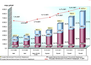 Существенно возрастает долговая нагрузка на федеральный бюджет: показатель отношения объема государственного долга к ВВП увеличится с 9,7 % в 2009 году до 15,4 % на конец 2012 года.