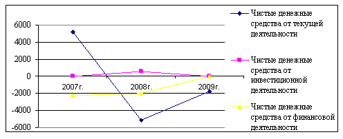 Тем не мене, из-за значительного отрицательного чистого денежного потока от текущей деятельности исследуемое предприятие в 2008 г. и в 2009 г. получило чистое уменьшение денежных средств на 6619 тыс. руб. и 1788 тыс. руб. соответственно.
