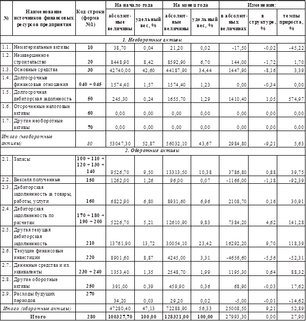 В целом можно отметить, что у предприятия улучшается финансовое состояние о чем говорит рост имущества предприятия. Предприятие поменяло структуру имущества. Если на начало года необоротные активы преобладали над оборотными, то уже на конец года оборотные активы заняли больший вес, чем необоротные. Однако, так как изменение произошло в основном за счет увеличения дебиторской задолженности, рост оборотных активов является негативным моментом для предприятия.