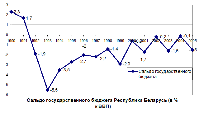 В 1991г. Беларусь была объявлена суверенной. Сальдо бюджета независимой республики, согласно официальной отчетности Министерства анализа и статистики, было положительным, и размер бюджетного профицита этого года составил 1,7% ВВП. В основном это объясняется тем, что государственный бюджет на 1991 год все еще предусматривал выделение дотаций нашей стране. С течением времени абсолютное значение бюджетного дефицита возрастало. Дефицит бюджета проявился в 1992 году в размере 1,9 % ВВП, и с тех пор является хроническим для республики. [10, с. 7-8]