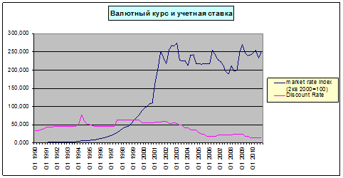 Следовательно, из графика видно, что до 1999г., когда учетная ставка была высокой, то и курс национальной валюты был высоким, но уже после с понижением учетной ставки национальная валюта начала девальвировать.