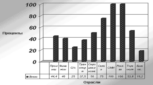 На рисунке видно, что Интернет используют все рекламные агентства и средства массовой информации, высокий процент использования Интернет предприятиями связи, а сельскохозяйственные предприятия и предприятия бытового обслуживания в большинстве своем не являются пользователями Сети.