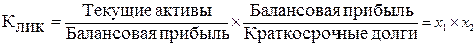 Коэффициенты ликвидности – показатели относительные и на протяжении некоторого времени не изменяются, если пропорционально возрастают числитель и знаменатель дроби. Само же финансовое положение за это время может значительно измениться, например, уменьшится прибыль, уровень рентабельности, коэффициент оборачиваемости и др. Поэтому для более полной и объективной оценки ликвидности можно использовать следующую факторную модель общего показателя: