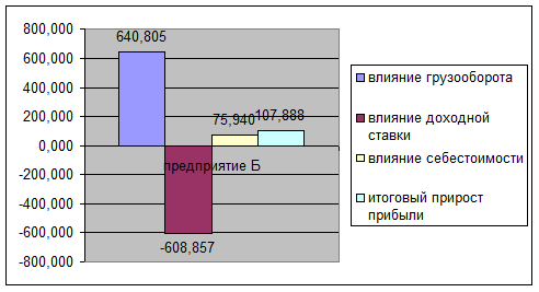 За счет снижения себестоимости прибыль предприятия Б возросла на 75,94 тыс. руб., из-за повышения объема работ прибыль возросла на 640,805 тыс. руб. Снижение прибыли из-за доходной ставки на 0,009 р/т-км. (т.е. на 7,05%) составляет 608,857 тыс. руб. В итоге прибыль предприятия Б возросла на 107,89 тыс. руб. т.е. на 7,22%, и составила 1603,1 тыс. руб. Рентабельность предприятия Б составила 24,97%.