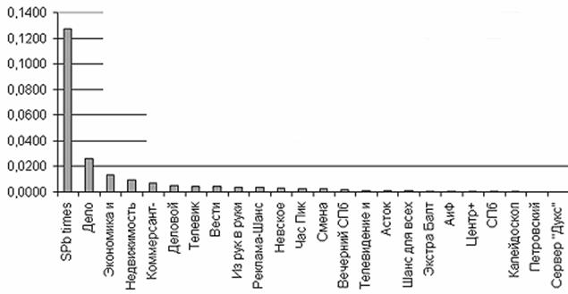 “Дукс”- по имеющимся неполным данным стоимость одного контакта на сервере составляет 0,00025 . При этом она сильно колеблется для отдельных его разделов, виртуальных серверов в зависимости от содержания разделов и виртуальных серверов, от давности их создания, интенсивности мероприятий по их популяризации в СМИ и Интернет. Так колебания располагаются в пределах от 0,63 (малоизвестный, недавний и узко специализированный сайт Гуманитарного Университета им. Дж. Сороса) до 0,00098 - давно популярный и притягательный сайт Russian Romance. Для обеспечения сопоставимости сравнения как скромный, но достаточный обьем рекламного материала в Интернет был взят 1 Мб (обьем достаточный для размещения не менее 3х страниц текста и графические материалов) и ссылка с тематического раздела сервера (страницы второго уровня) с ежемесячной платой 100 и 70 руб. соответственно. Со 100% вероятностью можно говорить о том, что читатели видели обложку издания и могли заметить там Вашу рекламу, достоверность того, что читатель увидит, например, 3 или 5 страницу издания с Вашим обьявлением заметно снижается. Для адекватности сравнения для сервера “обложкой” является его главная - Home страница. Ссылка с тематического раздела сервера адекватна выделенному фрагменту обьявления на 2 странице издания, привлекающего внимание читателя к массиву рекламного материала внутри номера. Для получения стоимости рекламного контакта стоимость обьвления была разделена на аудиторию одного номера - результат стоимость одного рекламного контакта в долларах. Для сервера расчет произведен так: стоимость минимального набора - (1 Mb + ссылка ) 170 руб/мес., пересчитанная к стоимости в день и выраженая в долларах, отнесена к числу контактов-числу посетителей сервера в день (среднестатистическое количество индивидуальных, отдельных компьютеров обратившихся к Home странице за неделю (среднее число за февраль с необходимыми поправками составило 30535 человек) разделенному на количество дней в неделе .