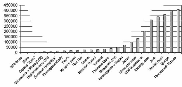 По данным “Экро-RG” (“СМИ: Аудитории и рейтинги” выпуск 4 (16) Декабрь 1997) число читателей изданий - “аудитория за период (неделя, месяц, четыре месяца) - общее количество людей хотя бы раз обратившихся к данному изданию”) аудитория приведена за неделю для ежедневных изданий (“выходящих 3-5 раз в неделю”), за месяц- для еженедельных (издания, выходящие 2-8 раз в месяц”).