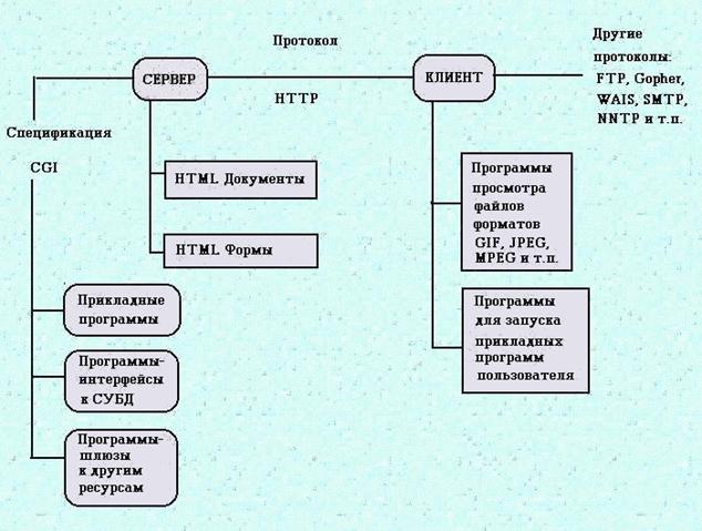 В круг этих функций входит не только размещение текста на экране, но обмен информацией с сервером по мере анализа полученного HTML-текста, что наиболее наглядно происходит при отображении встроенных в текст графических образов. При анализе URL-спецификации или по командам сервера клиент запускает дополнительные внешние программы для работы с документами в форматах, отличных от HTML, например GIF, JPEG, MPEG, Postscript и т. п. Вообще говоря для запуска клиентом программ независимо от типа документа была разработана программа Luncher, но в последнее время гораздо большее распространение получил механизм согласования запускаемых программ через MIME-типы. Другую часть программного комплекса WWW составляет сервер протокола HTTP, базы данных документов в формате HTML, управляемые сервером, и программное обеспечение, разработанное в стандарте спецификации CGI. До самого последнего времени (до образования Netscape) реально использовалось два HTTP-сервера: сервер CERN и сервер NCSA. Но в настоящее время число базовых серверов расширилось. Появился очень неплохой сервер для MS-Windows и Apachie-сервер для Unix-платформ. Существуют и другие, но два последних можно выделить из соображений доступности использования. Сервер для Windows - это shareware, но без встроенного самоликвидатора, как в Netscape. Учитывая распространенность персоналок в нашей стране, такое программное обеспечение дает возможность попробовать, что такое WWW. Второй сервер - это ответ на угрозу коммерциализации. Netscape уже не распространяет свой сервер Netsite свободно и прошел слух, что NCSA-сервер также будет распространяться на коммерческой основе. В результате был разработан Apachie, который по словам его авторов будет freeware, и реализует новые дополнения к протоколу HTTP, связанные с защитой от несанкционированного доступа, которые предложены группой по разработке этого протокола и реализуются практически во всех коммерческих серверах.