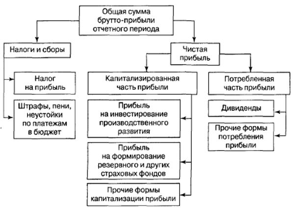 Распределение прибыли показано на рис. 3, из которого видно, что одна её часть в виде налогов и сборов поступает в бюджет государства и используется на нужды общества. Оставшаяся сумма – чистая прибыль – используется на выплату дивидендов акционерам предприятия, на расширение производства, создание резервного капитала и др.