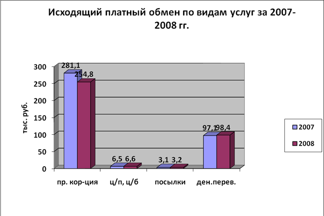 Согласно приведенным в таблице 1.4 и диаграмме 1 данным наблюдается рост по ценным письмам и бандеролям на 1,5%, по посылкам на 3,2%, по денежным переводам на 1,3%, В 2008 году по сравнению с 2007 годом уменьшилось только количество пересылаемой письменной корреспонденции и заказных писем на 9,4%.
