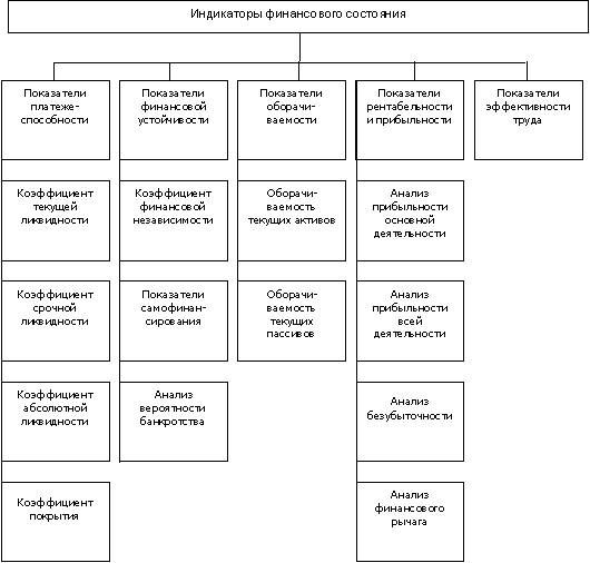 Набор экономических показателей, более детально и точно характеризующих финансовое положение и активность предприятия, должен предполагать расчет следующих групп индикаторов: анализ ликвидности (или платежеспособности), анализ финансовой устойчивости, анализ оборачиваемости (или деловой активности), анализ рентабельности и анализ эффективности труда. Классификация представительного состава индикаторов финансового состояния предприятия приведена на рис.1.