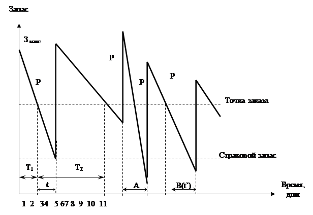 Нормируемыми величинами в этой системе являются величина заказа, размер запаса в момент размещения заказа (так называемая точка заказа) и величина страхового запаса. Заказ на поставку размещается при уменьшении наличного запаса до точки заказа. Как следует из чертежа, после размещения заказа запас продолжает уменьшаться, так как заказанный товар привозят не сразу, а через какой-то промежуток времени t. Величина запаса в точке заказа выбирается такой, чтобы в нормальной, рабочей ситуации за время t запас не опустился ниже страхового. Если же спрос непредвиденно увеличится (линия графика резко пойдет вниз - участок А графика), или же будет нарушен срок поставки (t¢ > t - участок В графика), то начнет работать страховой запас. Коммерческая служба предприятия в этом случае должна принять меры, обеспечивающие дополнительную поставку. Как видим, данная система контроля предусматривает защиту предприятия от образования дефицита.