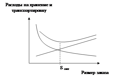 Рис. 5. Зависимость суммарных расходов на хранение и транспортировку от размера заказа. Оптимальный размер заказа – S опт