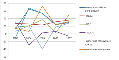 Рисунок 6 – Динамика темпов приростов основных налогов в 2002-2007 годах