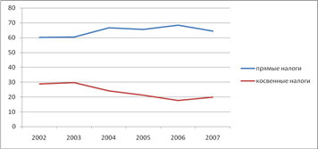 Приведенный график говорит о том, что в целом за рассматриваемый период произошло уменьшение доли косвенных налогов в формировании бюджета, и увеличение доли прямых налогов. По итогам 2007 года, доля прямых налогов составила 64,5 % от общей величины доходов консолидированного бюджета РФ; доля косвенных налогов – 19,94 %. В рамках анализируемого периода наблюдалась тенденция к росту удельного веса прямых налогов и сокращению удельного веса косвенных налогов.