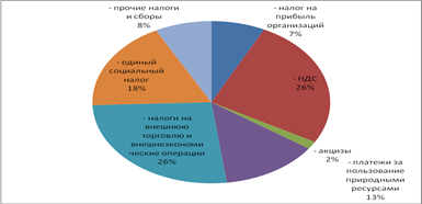 Итак, ключевую роль в формировании доходов федерального бюджета играют налог на добавленную стоимость (26 %), таможенные пошлины (26 %), единый социальный налог (18 %), платежи за пользование природными ресурсами (13 %). Доля остальных налогов составляет менее 10 %.