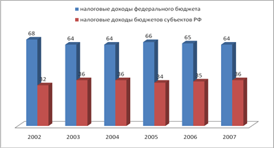 Рисунок 13 – Соотношение между налоговыми доходами федерального бюджета и бюджетов субъектов РФ в 2002-2007 годах