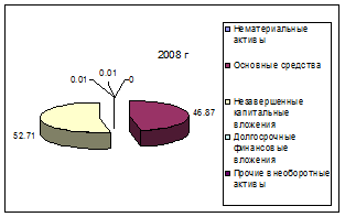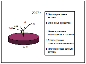 Такие статьи основного капитала предприятия, как нематериальные активы, прочие внеоборотные активы и долгосрочные финансовые вложения занимают менее 1% в структуре и изменение их удельного веса не оказывает существенного влияния на изменение структуры основного капитала предприятия за исследуемый период. Преобладание доли основных средств в структуре основного капитала предприятия отражено на диаграмме.