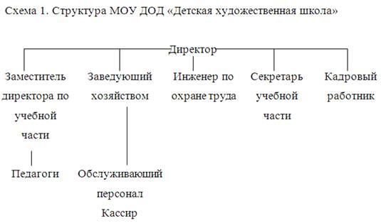 Учредителем МОУ ДОД «Детская художественная школа» является МУ управление культуры администрации МО «город Саянск» во главе школы находится директор. В его непосредственном подчинении находятся: заместитель директора по учебной части, заведующий хозяйством, инженер по охране труда, секретарь учебной части, кадровый работник, которые согласовывают свои решения с директором и доводят их до отдельных исполнителей. Они также осуществляют весь процесс деятельности школы.
