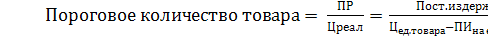 Данное количество товара характеризует «точку» окупаемости производства, ниже которой производство просто не выгодно. Каждая последующая единица товара приносит предприятию прибыль, величина которой определяется как произведение количества товара, проданного после порога рентабельности и отношения валовой маржи к общему количеству проданного товара.