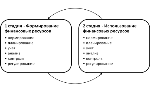 Рисунок 1.3 – Функции управления финансовыми ресурсами и стадии их воспроизводства