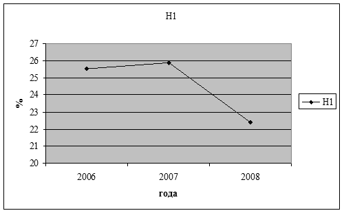 Минимально допустимое значение норматива Н1 устанавливается в размере 20%. В анализируемых периодах Н1 (норматив мгновенной ликвидности) составил 25.5%; 25.9%; 22.4%. Это больше 20%, что является положительным результатом деятельности банка (график 4). Иначе говоря, на каждые 10 рублей средств до востребования банк имеет в 2006 году 2.6 рублей, в 2007 году 2.6 рублей и в 2008 году 2.2 рублей высоколиквидных активов. Следовательно, банк сможет рассчитаться по своим обязательствам за 5 дней. Это говорит о высоком уровне ликвидности банка.
