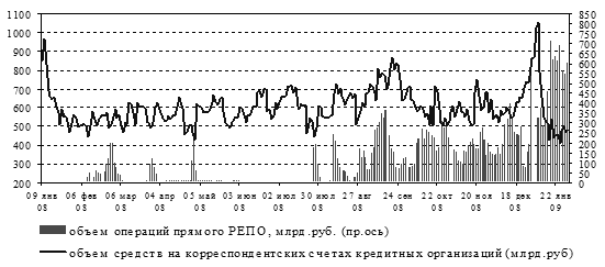 Рис.1.1. Объем средств на корсчетах кредитных организаций и операций прямого РЕПО [49, 28]