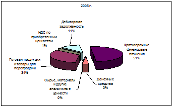 Графическое представление структуры определяет, что существенно значимыми составляющими оборотных активов являются: краткосрочные финансовые вложения – 51 %; товары для перепродажи – 34 %; дебиторская задолженность – 11 %. С точки зрения вида деятельности объекта исследования, нас в большей степени интересует дебиторская задолженность и товары для перепродажи. Краткосрочные финансовые вложения, учитывая данные бухгалтерской отчетности, являются предоставленными другим организациям займами.