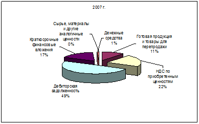 В 2007 г. удельный вес краткосрочных финансовых вложений сократился до 17%, по-прежнему существенная доля в общей сумме оборотных активов принадлежит товарам для перепродажи – 11 %; также увеличилась доля дебиторской задолженности в оборотных средствах – до 49%, что уже является отрицательным моментом: в 2007 г. половина всех оборотных средств организации используется не для целей хозяйственного оборота, исключено из него, что естественно снижает эффективность хозяйственной деятельности организации.